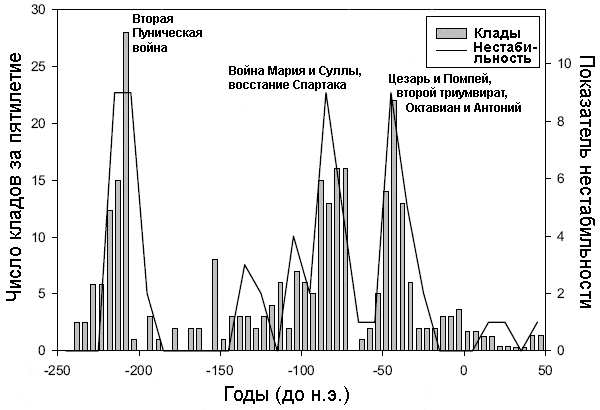 Так что связь политической и социальной нестабильности с числом кладов демонстрируется весьма наглядно. Американские исследователи показали, что и на конкретном отрезке римской истории — от 240 года до н.э. до 100 года до н.э, то есть за 150 лет — социальная нестабильность хорошо коррелирует с числом найденных кладов. На графике ясно видно соответствие обоих показателей, причем не только основных максимумов, но и общего хода кривых. Это означает, что частоту кладов можно использовать и для различных количественных ретроспективных оценок социальной обстановки в разных странах.
