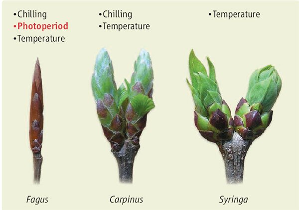 Например, бук — долгоживущее дерево, доминант широколиственного леса, представитель климаксного сообщества. В конце зимы, когда растение получило уже достаточную дозу заморозков, включаются регуляторы, реагирующие на длину светового дня; только после того, как света становится достаточно, включаются регуляторные системы, откликающиеся на температуру. Такая система приоритетов надежно защищает дерево от преждевременного завязывания почек и появления листочков. Если поспешить, то весенние морозы могут убить дерево, а новое еще не скоро вырастет. Такие деревья, даже если их культивировать в тропическом климате, всё равно начинают вегетацию только в марте, хотя круглый год стоит оптимальная для вегетации температура. Примерно так же регулируется сезонный цикл у дубов, каркаса и др.